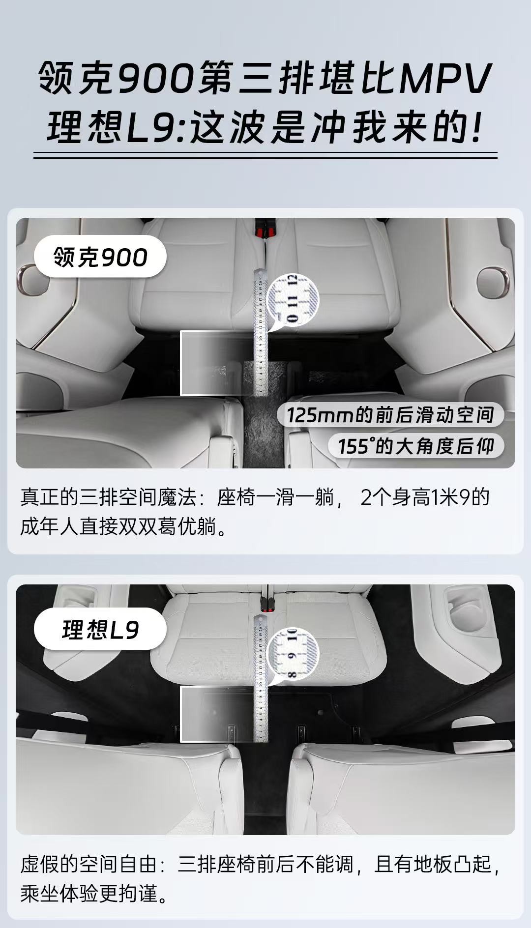 三排空间自由如何诠释?领克900三排拥有125mm的前后滑动空间,155°的大角度后仰,远超理想L9,三排空间平权,才是大空间的真正定义...