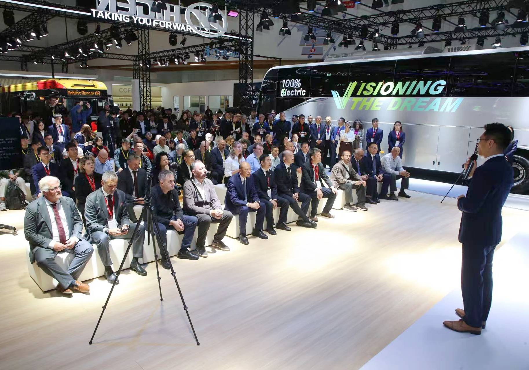 当地时间4日上午9点30分,苏州金龙召开新品发布会,面向欧洲市场一举推出3款纯电动新V系客车:高端旅游客运客车V12E、V12E Pro和城际客车V13E,来自全球30多个国家的客户、主流媒体以及行业专家到场参与。