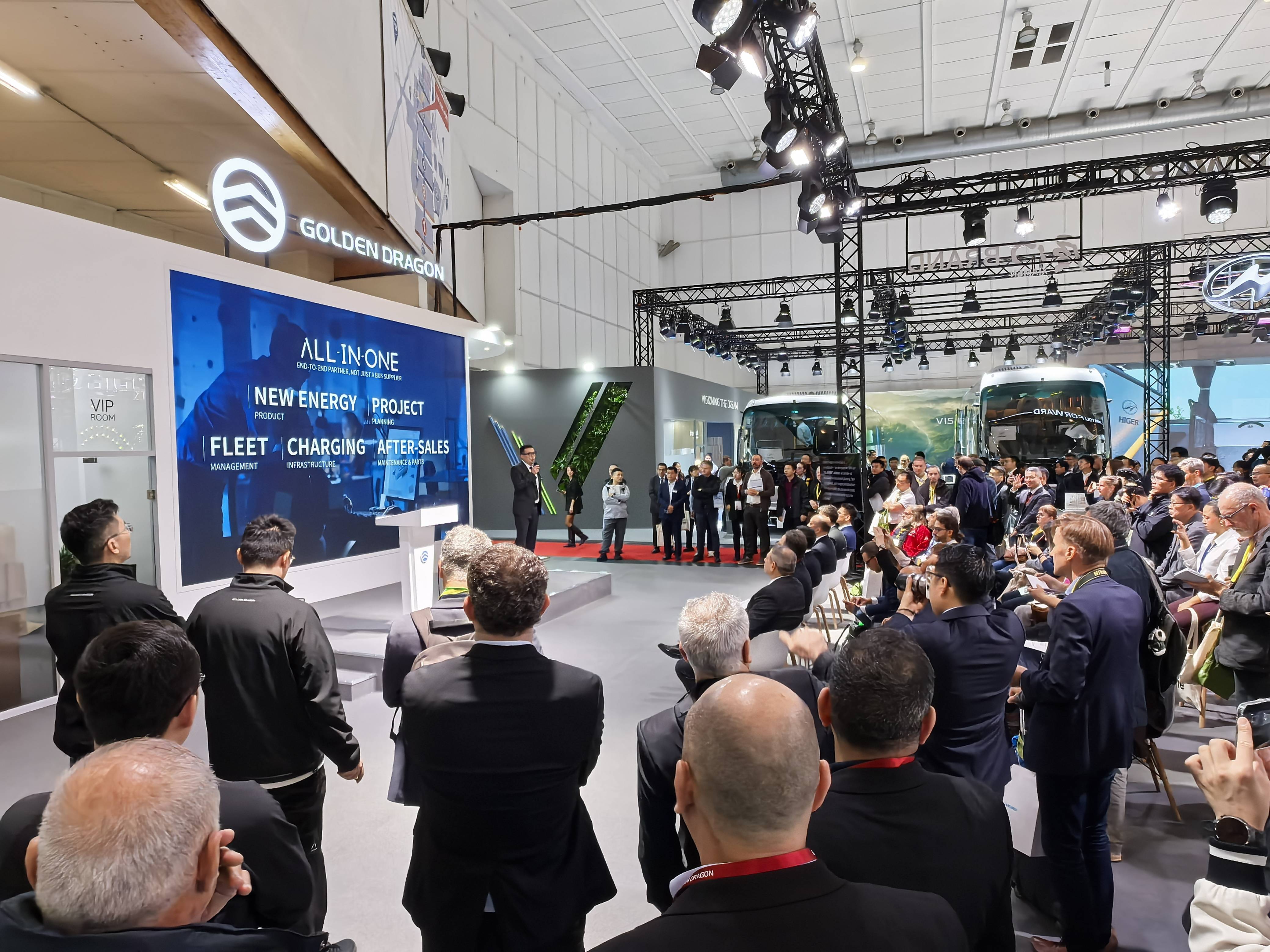 当地时间10月4日上午,金旅客车于比利时布鲁塞尔世界客车博览会现场展示全新一代高端客车GC15,同时亮相的还有PIVOT E15纯电动城市客车及GECKO纯电动轻型车。