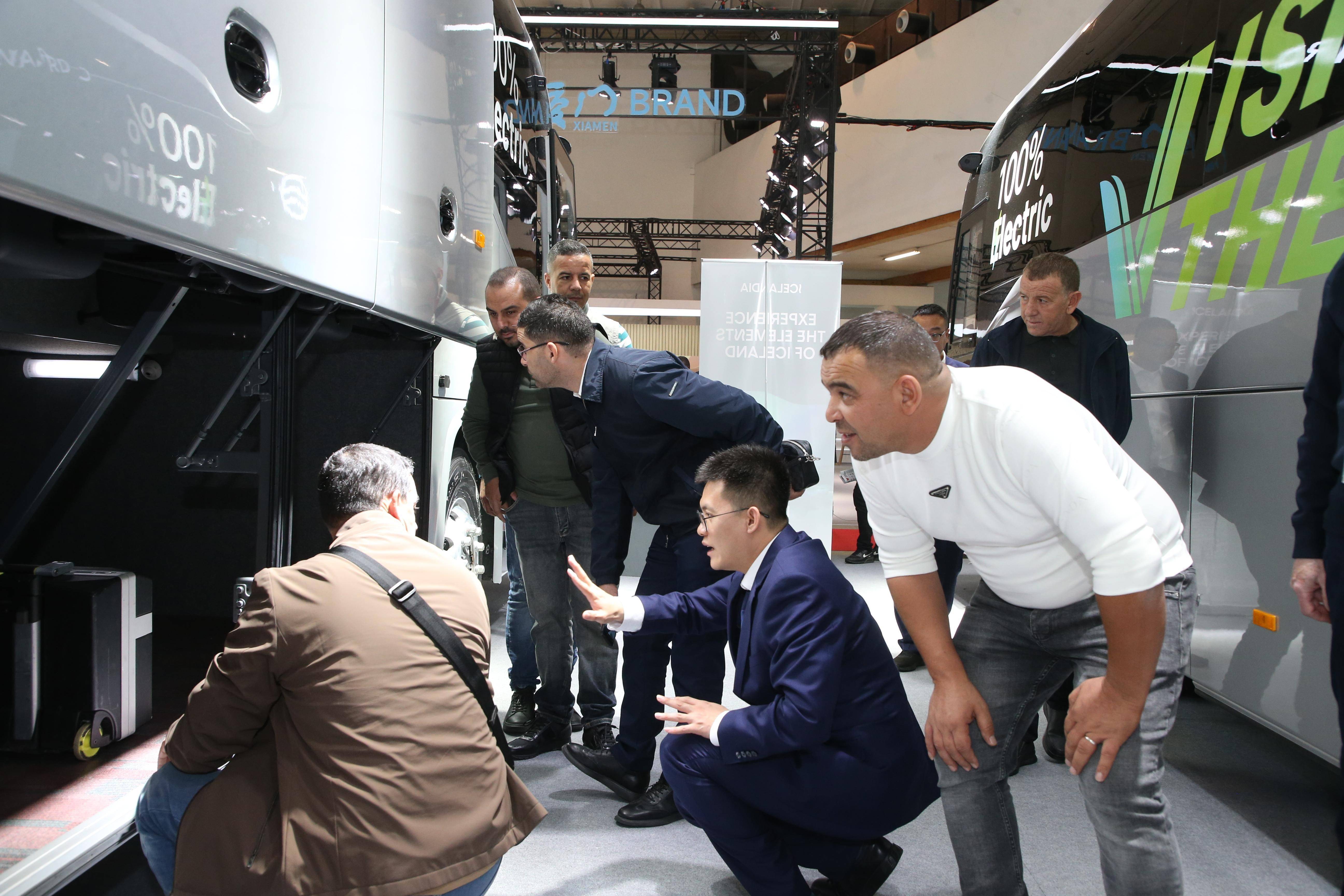 来自阿尔及利亚的嘉宾俯身查看车辆行李舱布局,询问行李舱容积。当得知出口冰岛的新V系车型首次在12米纯电客车上突破10m?的超大行李舱空间后,阿尔及利亚嘉宾由衷地为苏州金龙点赞。